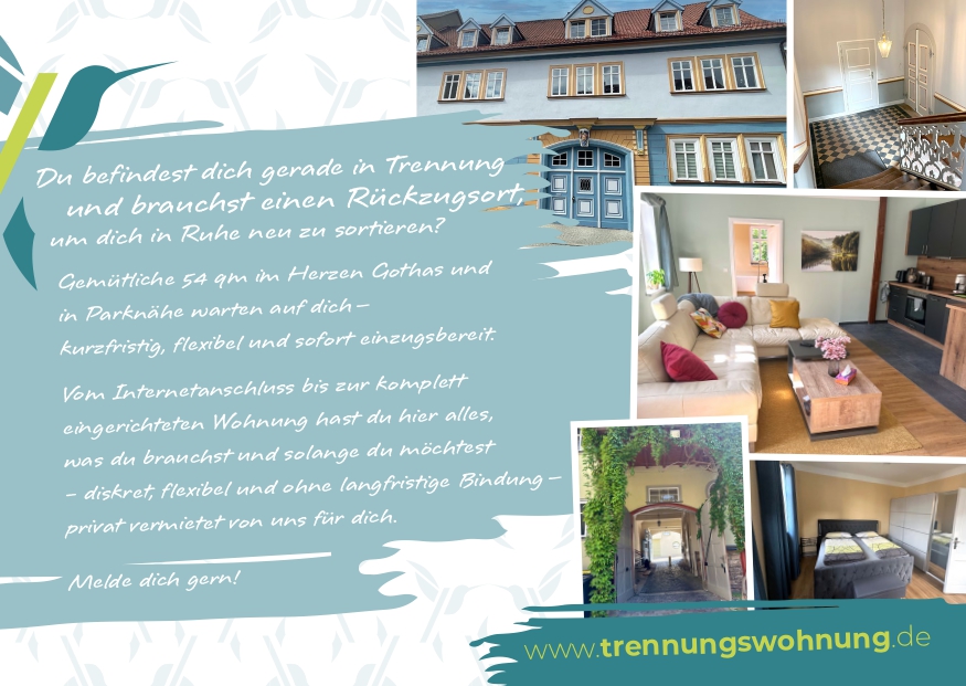 Eine Trennung ist eine herausfordernde Zeit. Deshalb bieten wir Ihnen eine komfortable und frisch sanierte Wohnung im Herzen von Gotha. Unser Fokus liegt darauf, Ihnen in dieser sensiblen Lebensphase eine sichere und angenehme Umgebung zu bieten.